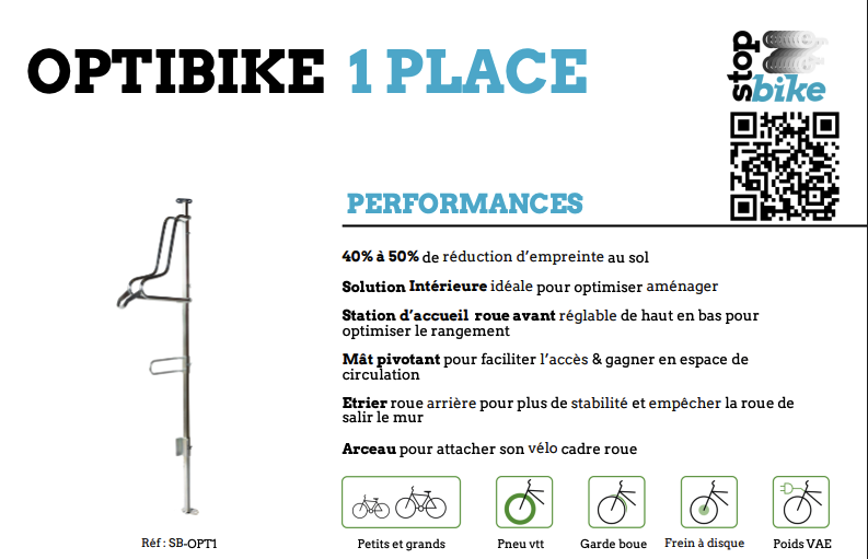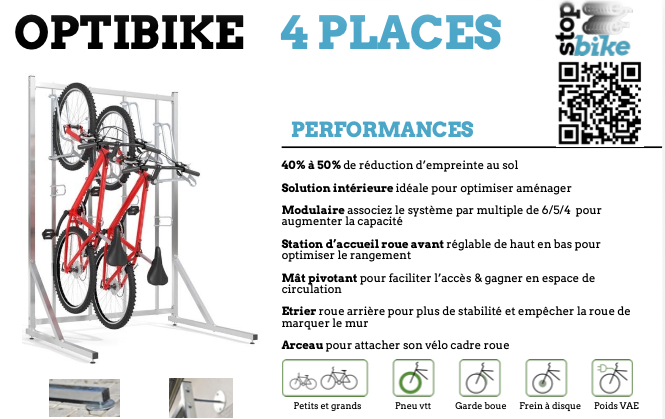 - Station d’accueil roue avant réglable de haut en bas pour optimiser le rangement
